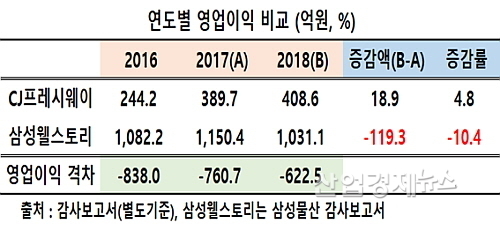 외식 경기 침체 지속과 최저 임금의 급격한 인상 같은 업계의 공통적 영업환경 악화에도 불구 CJ프레시웨이가 408.6억 원의 영업이익으로 전년 동기 389.7억 대비 4.8% 증가한 반면, 삼성웰스토리는 10.4% 줄어든 1031.1억의 영업이익을 시현, 대조적 손익 성적표를 제출한 것.