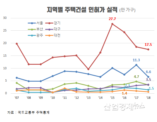 지역별로도 시장규모가 가장 큰 경기지역이 예년에는 10~15만 가구 수준이었지만 2015년 28만 가구로 두 배 가까이 공급이 늘었고, 서울도 5~7만 가구 수준에서 11만 가구까지 공급이 늘었다. 1~2만 가구였던 부산, 대구도 3~5만 가구까지 물량이 늘었다.