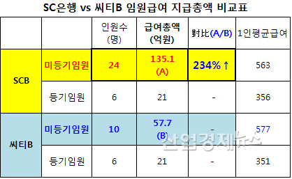SC은행과 씨티B가 거둔 지난해 당기순익을 토대로, 미등기 임원수 1인당 순익을 산출했다.
