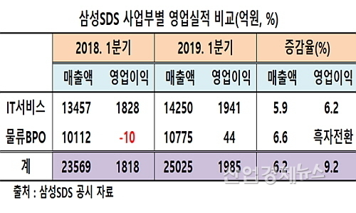 최근 공시된 삼성SDS의 잠정 영업실적에 따르면 연결재무제표 기준 올 1분기 매출은 2조5025억 원으로 전년 동기 2조3569억 대비 6.2% 증가했다.
