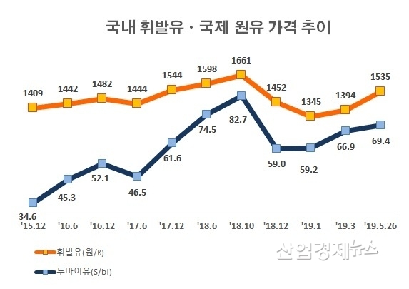 2015년 국제유가는 30달러선까지 하락했다. 그리고 이후 유가는 계속 상승해서 2018년 10월 83달러까지 올랐다. 그리고 지난 연말 산유국의 공급확대로 유가는 50달러대로 떨어졌다가 미국이 셰일가스로 대응하면서 유가는 다시 70달러 선까지 증가했다.