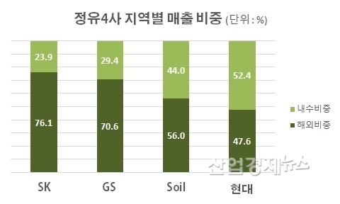 정유4사의 지난해 연간 매출을 지역별로 나눠보면 SK이노베이션의 경우 수출 등 해외매출이 전체 매출의 76.1%로 해외영업에 크게 의존하고 있다. GS칼텍스도 해외비중이 70.6%나 돼 국제유가 변동의 영향을 크게 받는 사업구조를 갖고 있다. S-OIL은 56.0%로 매출의 절반 이상이 해외에서 이뤄진다.