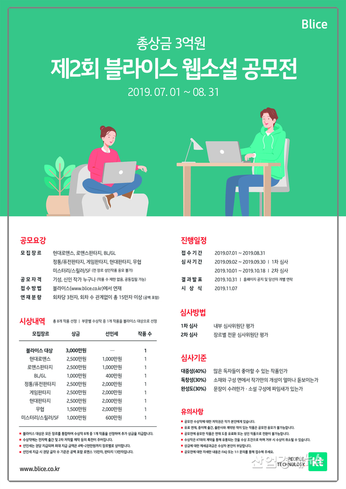 [산업경제뉴스 최기훈 기자] KT가 블라이스 웹소설 공모전을 개최한다. 블라이스는 KT에서 운영하는 웹소설 플랫폼이다.