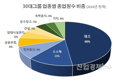 2018년 현재, 30대그룹에서 제조업이 차지하는 비중은 다소 줄어든 반면, 그동안 종업원수가 많이 늘어난 임대시설관리업종과 금융보험업종 등은 비중을 늘려갔다.