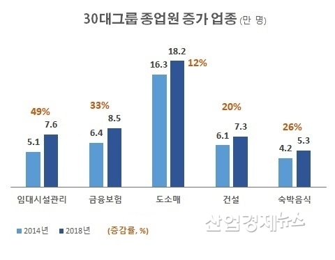 또, 금융보험업의 종업원수도 2014년 6만4466명에서 2018년 8만5493명으로 33%나 늘었다. 농협과 한국투자금융이 2016년에, 교보생명보험이 2017년에 30대 그룹에 신규진입하면서 금융보험업의 종업원수가 증가한 것으로 분석된다.