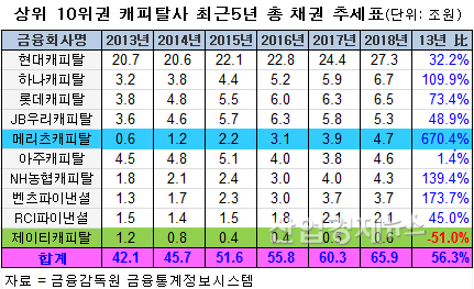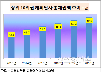 금융감독원 금융통계정보시스템에 따르면, 국내 캐피탈 사들의 지난해 말 총 채권액은 5년 전인 2013년 42.1조원에서 지난해 65.9조원으로 56.3% 성장한 것으로 나타났다.