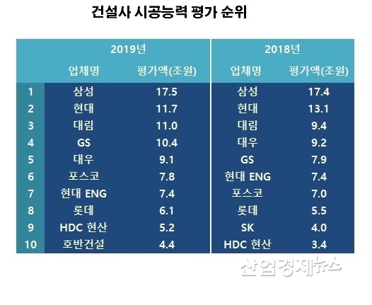 지난해와 비교하면 1~3위까지는 순위변동이 없고 GS건설과 대우건설이 4, 5위 순서를 바꿨으며 포스코와 현대엔지니어링도 6, 7위 순서를 바꿨다.