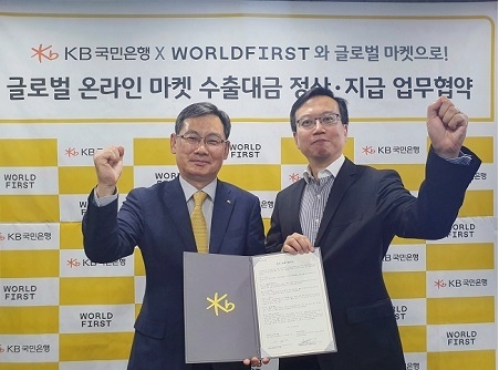 국민은행은 23일, 글로벌 전자상거래 정산 서비스 전문기업인 월드퍼스트와 '글로벌 온라인 마켓 수출대금 정산지급 업무협약'을 체결했다고 밝혔다.
