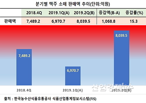 먼저 한국농수산식품유통공사(aT)의 식품산업통계정보시스템 집계 결과 올 2분기 맥주 소매 판매액은 8039.5억으로 지난 1분기 6970.7억 대비 1068.8억 원 증가해, 약 15.3% 성장했다.