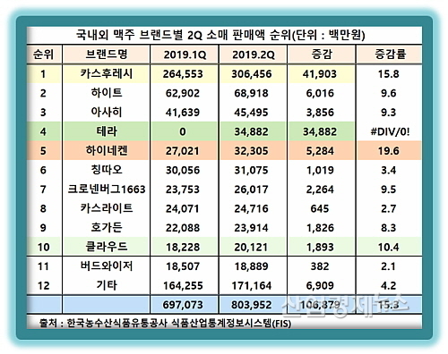 하지만 3월말 출시된 하이트진로의 ‘테라’가 불과 2분기 3개월 동안 348.8억 원의 판매고를 올리며 1분기에 4위였던 ‘칭따오’를 밀어내고 일약 4위에 등극하는 파란을 일으켰다.