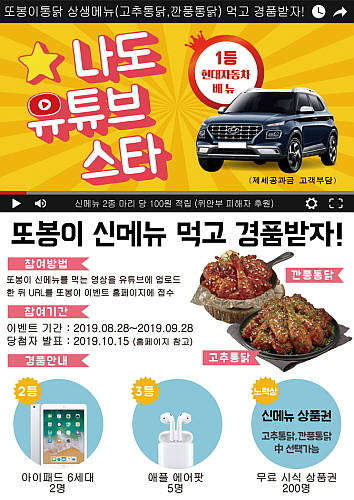 신메뉴의 특징을 잘 표현한 동영상을 유튜브에 업로드한 후 또봉이통닭 홈페이지에 URL을 게시하면 심사를 통해 1등(1명)에게 현대자동차 베뉴, 2등(3명)은 아이패드6세대, 3등(5명)은 애플 에어팟을 경품으로 증정한다.