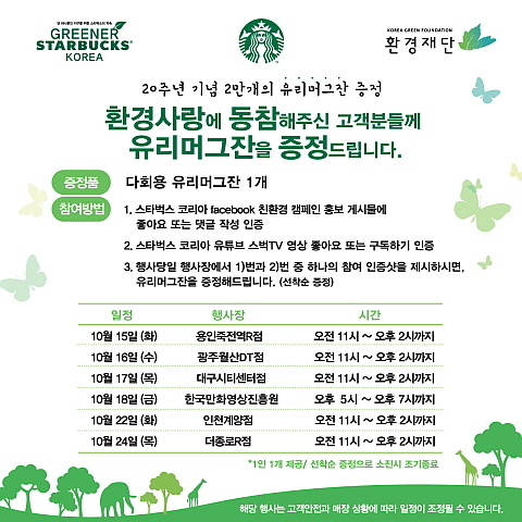 [산업경제뉴스 민혜정 기자] ㈜스타벅스커피 코리아(대표 송호섭)가 올해 개점 20주년을 기념해서 환경재단과 함께 일회용컵 사용을 줄이고 개인컵 사용을 권장을 위해 2만개의 다회용 유리머그잔을 증정하는 환경 캠페인을 온라인과 오프라인에서 10월 24일까지 전개한다.