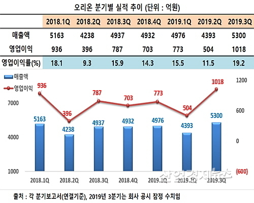 2018년 1분기 936억, 2분기 396억, 3분기 787억, 4분기 703억, 올 1분기 773억을 기록한 후 지난 2분기에 504억으로 크게 밀리더니 급기야 3분기에 1018억 원을 시현하는 양호한 성적표를 시장과 투자자에게 내민 것.