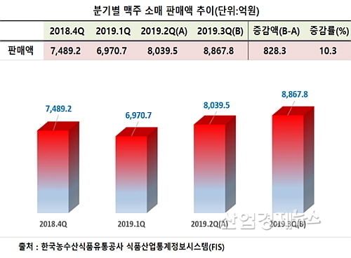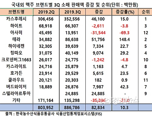 [산업경제뉴스 민혜정 기자] 올 3분기 국내 맥주시장 소매판매 규모가 ‘테라’의 돌풍과 카스후레시 선전 등 국산 브랜드 의 약진에 힘입어 지난 2분기 대비 10.3% 가량 성장한 것으로 조사됐다.
