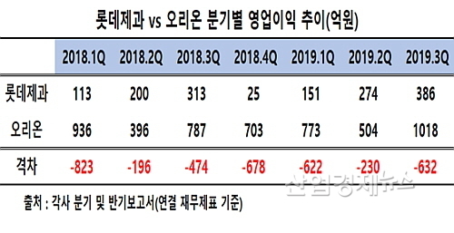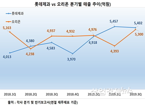 실제로 국내사업(별도재무제표 기준)의 경우 롯데제과의 올 3분기까지 누적 매출은 1조1765억 원으로 오리온의 5385억 보다 약 2.18배 더 많다.