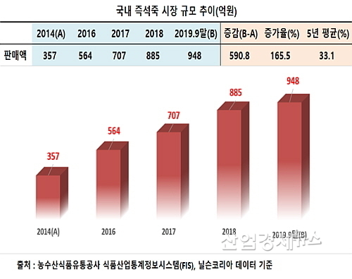 [산업경제뉴스 민혜정 기자] 국내 즉석죽(간편죽)시장이 경기불황에도 전혀 위축됨이 없이 고공 성장을 펼치고 있는 것으로 조사됐다. 지난 2014년 이후 올 9월까지 최근 5년간 국내 즉석죽 소매판매액이 연평균 33.1% 씩 증가한 것으로 나타난 것.