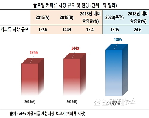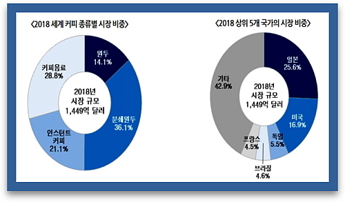 [산업경제뉴스 민혜정 기자] 지난 2018년 기준 전세계 커피류 제품 시장 규모는 2015년 1256억불 대비 약 15.4% 성장한 1449억 달러(미국 달러화 기준)로, 이중 그 규모가 가장 큰 나라는 일본인 것으로 조사됐다.