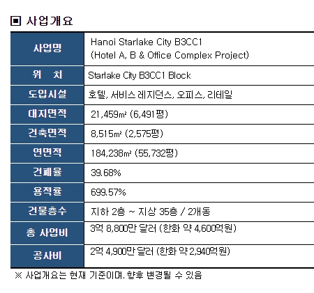 [산업경제뉴스 최기훈 기자] 대우건설(대표이사 김형)이 진행 중인 베트남 하노이 스타레이크시티 신도시에서 국내 금융기관과 함께 출자한 펀드를 통해 직접 투자개발사업을 추진한다.