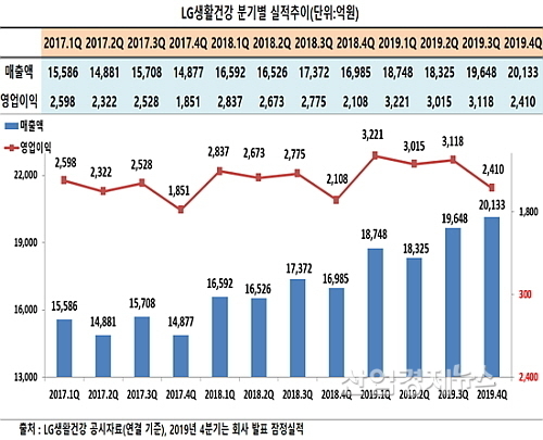 최근 LG생활건강이 공시한 잠정영업실적에 따르면 2019년 4분기 매출은 연결재무제표 기준 2조133억에 영업이익 2410억 원을 달성해, 전년 동기 대비 각각 18.5%, 14.3%씩 증가했다.
