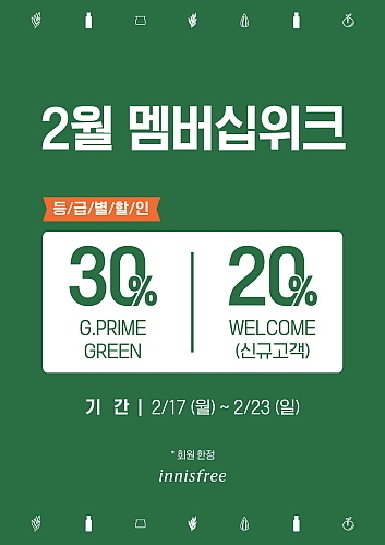 ‘멤버십위크’는 기존 멤버십데이의 확장판으로 이니스프리 회원 대상 할인 행사다. 회원 누구나 할인 혜택을 받을 수 있는 멤버십 세일로 그린프라임/그린 등급은 30%, 웰컴 등급은 20%로 등급별 할인이 적용된다.