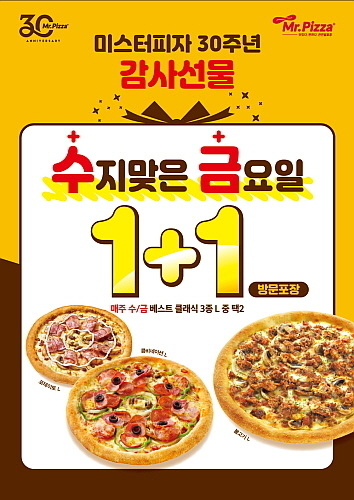 미스터피자는 창립 30주년을 맞아 연말까지 매주 수요일과 금요일 스테디셀러 클래식피자 3종에 대해 방문포장 시 원하는 피자를 하나 더 제공하는 ‘미스터피자 30주년 기념 수지맞은 금요일’ 행사를 진행한다.