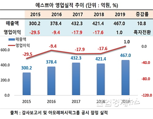 에스쁘아 감사보고서와 아모레퍼시픽그룹이 공시한 2019년 잠정영업실적에 의거해 설립 첫 해인 2015년부터 지난해까지 영업실적을 살펴보면,