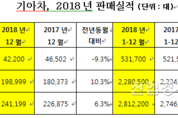 [엔트로피타임즈김소산 기자]기아자동차는 2018년 한해 국내 53만 1700대, 해외 228만500대 등 전년 대비 2.4% 증가한 281만 2200대를 판매했다. 이는, 전년 대비내수 1.9%, 해외 2.5%늘어 총 2.4% 증가, 2015년 이후 3년만에 플러스 성장한 수치다. 차종별 글로벌 판매는 스포티지가 50만 1367대로 베스트 셀링카에, 리오(프라이드)가 35만 5852대, K3(포르테)가 32만8504대로 뒤를 이었다. 내수에서 모닝이 총 23만7601대가 판매돼 1위를 달렸다. K시리즈는 총 14만 5838대가 팔리며전년 대비 27.4% 증가해 뒤를 이었다. RV 모델은 카니발이 7만 6362대, 쏘렌토 6만7200대, 스포티지 3만7373대 등 총 23만2006대가 판매됐다. 해외판매에서는스포티지가 전년 대비 12.1% 증가한 46만3994대로 1위를, 리오(프라이드)가 35만 5852대, K3(포르테)가 28만 3990대로 뒤를 이었다. ■ 2018년 12월, 6.3% 증가 한편, 지난해 12월 한달간 기아차는국내 4만2200대, 해외 19만 8999대 등 총 24만 1199대를 판매했다. 국내시장에서는 K9가 지난 4월 이후 9개월 연속