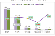 [엔트로피타임즈 김소산 기자] 현대자동차, 기아자동차, 한국지엠, 르노삼성자동차, 쌍용자동차로 대표되는 완성차 5사의 지난달 총 판매량은 지난해 같은 달 보다 5.0% 마이너스 성장을 한 것으로 나타났다. 부문별 성장률은 내수 – 0.3%, 해외(수출포함) -6.0%를 기록해 전체적으로 –5.0% 로 11월을 마감했다. 업체별 내수판매는 쌍용차가 직 전월인 10월 25.0% 증가에 이어 지난달에도 17.8%가 늘어 가장 높은 성장세를, 르노삼성은 9월과 10월 각각 –34.6%, -5.4% 감소세에서 지난달 1.3% 플러스 반전에 성공했고 이어서 현대차가 0.4% 증가해 뒤를 따랐다. 반면, 한국GM은 지난 2월부터 8개월 연속 감소세에서 10월에 직전년도 추석연휴(10월)에 의한 15.9% 반짝 성장을 보인 후, 지난달 19.9%가 줄어 또다시 하락추세를 이어갔고, 기아차가 –0.7%로 뒤를 이었다. 특징은, 보합수준의 내수판매와는 달리, 수출(해외 판매포함)에서는 완성차 5社 모두 하락세를 면치 못했다. 업체별로는 르노삼성이 10월 –21.9% 이어 지난달 –41.6%로 낙폭을 키워갔고, 쌍용차 –14.2%로 두 자리 감소를, 이어서 한국GM –5.8%,