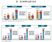 [산업경제뉴스 문성희 기자] 중국의 경제력이 빠르게 성장하면서 세계 경제지도가 달라지고 있다. 한국에게는 중국의 급성장이 위기가 될 수 있지만 다른 한편 새로운 기회가 찾아 오기도 한다. 철강, 조선, 반도체 등 우리의 주요 수출품들이 중국의 저가물량 공세로 큰 위기를 겪기도 했지만, 유화, 화장품, 서비스 산업 등은 새로운 시장을 얻을 수 있었고 대규모 국제 건설 수주에서는 한국의 기술력과 중국의 자본력이 결합해 함께 수주를 따내기도 한다. 양국 성장 속도의 차이로 인해 최근 중국의 글로벌 위상이 급격히 높아지면서, 글로벌 시장에서 중국과 경쟁해야하는 한국 경제는 새로운 경쟁력 강화의 숙제를 떠안게 됐다. 재계에서는 이러한 문제를 해결하지 않으면 갈수록 세계시장에서 한국경제가 위축될 수 있다고 경고하고 있다. 전국경제인연합회(이하 전경련)는 한중 수교 29주년을 맞아 지난 30여 년 동안 양국의 경제력 변화를 비교한 결과를 발표했다. 가장 먼저 대표적인 경제지표인 국내총생산(GDP)을 살펴봤다. 명목 기준으로 한국의 GDP는 30년 전인 1992년, 3,560억 달러였고 30년이 흐른 지난 2020년 1조 6,310억 달러로 성장했다. 약 4.6배 증가하며