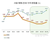 [산업경제뉴스 문성희 기자] 9월에 이어 10월 들어서도 서울 아파트 가격 상승률이 계속 감소세를 보이고 있다. 6주 연속 상승률이 줄어드는 모습이다. 부동산114에 따르면, 서울 아파트 매매가격 상승률은 지난 8월 마지막 주에 0.11%까지 올라갔지만 9월 들어 0.07%로 급격히 감소하더니 이후 9월 내내 하락세가 이어져서 10월 첫째 주에는 0.04%까지 떨어졌다. 매매가격 상승률이 이렇게 축소되고 있는 가운데도 전세가격 상승률은 오히려 커졌다. 전세가격 상승률도 8월 마지막 주에 0.13%까지 올라갔지만 이후 9월 들어 감소세를 보이면서 0.10%로 내려왔지만 10월 들어 다시 강세를 보이면서 0.11%로 올라갔다. 부동산114는 매매 가격 약세에 대해, 추석 이후 관망세가 이어지고 있고, 거래가 줄었는데도 매물이 쌓이지 않고 있다고 설명했다. 또 매도자와 매수자 간 눈치장세가 계속되면서 거래가 이뤄지지 않는다고 진단했다. 전세는 임대차 3법 시행과 코로나19로 재계약 위주로 시장이 재편되면서 전세매물 기근이 더 심해지고 있다고 분석하며, "부르는게 값"이라는 말까지 나오고 있다고 전했다. 한편, 수도권에서도 아파트 매매가격 상승세는 지역별로 큰 차이