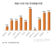 [산업경제뉴스 문성희 기자] 매출 상위 10대 기업의 매출이 국내에서 절반 가량 이뤄지는 것으로 나타나, '수출주력 기업', 글로벌 기업'이라는 수식어와는 아직 거리가 있다는 평가다. 삼성전자, 현대자동차, LG전자, SK이노베이션, (주)한화, 삼성물산 등 매출 상위 10대 회사들의 매출을 지역별로 구분해 보면 국내비중이 44%, 해외비중이 56% 인 것으로 조사됐다. 이들 회사의 전체 평균은 국내 매출보다 해외매출이 많지만, 반도체 회사인 삼성전자와 SK하이닉스 2개 회사를 제외한 나머지 회사의 국내 매출 비중은 53%로 조사됐다. 국내에서 실현되는 매출이 수출이나 해외법인의 매출보다 더 많은 것으로 나타나 여전히 국내 영업이 주력사업이라는 분석이 나온다. 한국경제연구원 (이하 한경연)은 7일, 기업분석보고서를 통해 2018년 매출 100대기업의 지역별 매출을 발표했다. 이 보고서에 따르면 매출 상위 10대 회사 중, 해외 매출비중이 가장 큰 회사는 반도체 회사인 SK하이닉스로 매출의 98%가 해외에서 이뤄졌다. 그 다음은 역시 반도체를 생산하고 있는 삼성전자로 해외 매출비중이 86%로 나타났다. 하지만 이 두 회사를 제외하면 곧바로 60% 수준으로 떨어