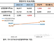 [산업경제뉴스 민경종 기자] 국내 리딩뱅크(금융그룹) 자리를 놓고 치열한 경합을 벌이고 있는 KB금융지주와 신한금융지주의 상반기 손익성적을 비교한 결과 신한이 영업이익과 순이익 증가율에서 모두 열세를 기록, 완패(?)를 당한 것으로 나타났다. 그 배경은 각 사별 은행, 증권, 카드, 생명보험, 손해보험 등의 금융 자회사들 가운데, 특히 은행과 보험사의 상대적 실적 열세가 결정적 요인이 된 것으로 분석된다. 우선 양사 반기보고서에 의거해 연결재무제표 기준 올 상반기 영업이익 증가율부터 살펴보면 신한금융지주가 전년 동기대비 약 3.0% 감소한 반면, KB금융지주는 23.9%나 신장해 대조를 보였다. 여기에다 영업외손익까지 반영한 반기순이익 증가율에서도 신한이 -1.4%를 기록한 반면, KB금융지주는 오히려 11.8%나 증가해 신한지주를 압도했다. 이로써 올 상반기까지 양사 손익 성적은 KB금융지주가 신한지주에 2개 부문 모두 완승을 거둔 것으로 봐도 무방하다는 것이 금융가의 평가다. 아울러 지난 2020, 2021 2년 연속으로 톱 자리를 유지하다가 지난해 신한금융지주에게 톱 자리를 내어준 KB금융지주가 연간으로도 이러한 우위를 유지해 리턴매치에 성공하며 다시금