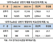 [산업경제뉴스 민경종 기자] 국내 라면시장 1, 2위를 달리는 농심과 오뚜기의 올 상반기 실적을 분석한 결과, 농심이 매출과 손익 증가율 양 부문 모두 우위를 보이며 완승을 거둔 것으로 나타났다. 특히 영업이익의 경우 오뚜기가 전년 동기 대비 21.7% 신장에 그친 반면, 농심은 204.5%나 급증하는 압도적 우위의 손익성적표를 시장과 투자자에게 내밀었다. 매출증가율, 농심이 오뚜기에 2.1%P 앞서..매출격차도 크게 줄여 그렇다면 양사의 올 상반기 실적은 지난해 상반기와 비교해 어떠했을까? 각사 반기보고서에 따르면 해외법인 등 종속기업 실적을 포함한 연결재무제표 기준 농심의 상반기 매출은 1조6979억 원으로 전년 동기 1조4925억 대비 약 2054.4억 원이 늘어 13.8% 증가했다. 이를 세부적으로 설펴보면 매출에누리액 등 공제 전 기준으로 라면, 스낵, 음료 등 전 카테고리 제품(상품)이 고르게 성장하며 전사 외형증가세를 합작해냈다. 라면류가 1600억 원(13.6% 증가), 스낵류가 353억(16.6%), 음료 등 기타부문이 약 322.9억(11.7%)등 총 2276.3억이 늘었고, 여기에다 매출에누리 순증액 221.9억을 차감한 2054.4억 원