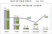 [산업경제뉴스 김소산 기자] 현대자동차, 기아자동차, 한국지엠, 르노삼성자동차, 쌍용자동차로 대표되는 완성차 5사의 지난달 총 판매량은 지난해 같은 달 보다 5.0% 마이너스 성장을 한 것으로 나타났다. 부문별 성장률은 내수 – 0.3%, 해외(수출포함) -6.0%를 기록해 전체적으로 –5.0% 로 11월을 마감했다. 업체별 내수판매는 쌍용차가 직 전월인 10월 25.0% 증가에 이어 지난달에도 17.8%가 늘어 가장 높은 성장세를, 르노삼성은 9월과 10월 각각 –34.6%, -5.4% 감소세에서 지난달 1.3% 플러스 반전에 성공했고 이어서 현대차가 0.4% 증가해 뒤를 따랐다. 반면, 한국GM은 지난 2월부터 8개월 연속 감소세에서 10월에 직전년도 추석연휴(10월)에 의한 15.9% 반짝 성장을 보인 후, 지난달 19.9%가 줄어 또다시 하락추세를 이어갔고, 기아차가 –0.7%로 뒤를 이었다. 특징은, 보합수준의 내수판매와는 달리, 수출(해외 판매포함)에서는 완성차 5社 모두 하락세를 면치 못했다. 업체별로는 르노삼성이 10월 –21.9% 이어 지난달 –41.6%로 낙폭을 키워갔고, 쌍용차 –14.2%로 두 자리 감소를, 이어서 한국GM –5.8%,
