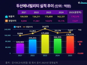 [엔트로피타임즈 민경종 기자] 두산그룹 대표 에너지기업 두산에너빌리티가 지난해 외형 성장세 지속에도 불구, 손익이 두 자릿수나 악화돼 실속 없는 장사를 한 것으로 밝혀져 그 배경에 궁금증이 일고 있다. 국내외서 원전과 가스발전, 해상풍력 가스터빈 등 에너지사업의 수주가 잇따르면서 지난 2023년에 기록했던 외형 고점에 한층 더 다가섰지만, 수소 관련 사업과 건설 중장비 사업의 부진 여파로 외형과 배치되는 손익 성적표를 작성한 것. 그렇다면 동사의 최근 외형과 영업이익은 어떠한 궤적을 그려왔고, 앞으로의 실적 전개 방향은 어떠할까? 먼저 동사의 감사보고서(연결기준)에 의거해 지난 2021년부터 지난해까지 매출과 영업이익 추이를 살펴보면, 우선 매출은 2021년 10조9909억 원, 2022년 15조4211억, 2023년 17조5899억, 2024년 16조2331억, 그리고 지난해 17조579억 원(잠정치)을 시현, 2023년에 기록했던 매출 최대치를 향해 상승세를 이어가는 흐름을 연출했다. 반면에 영업이익은 2021년 8694억, 2022년 1조1061억, 2023년 1조4673억 원을 올려 고점을 찍은 후 2024년 1조176억, 2025년엔 7627억 원(