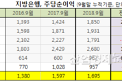 [엔트로피타임즈 김소산 기자] 부산은행, 대구은행, 경남은행, 광주은행, 전북은행, 제주은행으로 대표되는 지방은행들의 지난 3분기(누적) 기준,주당순이익(이하, 순이익)이 1년 전 같은 기간보다 6.2% 늘어난 것으로 조사됐다. 주당순이익은 당기순이익을 주식수로 나눈 값으로, 주로 수익성 관련 경영성과 지표로 활용된다. 산업경제뉴스가 국내 지방은행들의 지난해 3Q 순이익을 조사해 본 결과, 6개 지방은행의평균순이익은 1695원으로 직전년도(1597원) 보다 6.2%(98원↑) 증가한 것으로 나타났다. 은행별로는, 전북은행이 1년 전에 비해 60.3%가 늘어 가장 높은 성장세를 구가했고, 이어서 부산은행 29.9%, 광주은행 10.3%, 대구은행 3.2% 순으로 증가했다. 반면, 같은 기간 경남은행은 -19.6%, 제주은행 –6.9%로 실적대조를 보이며 부진을 나타냈다. 실적증가 관련, 부산은행은 이자이익 확대와 대손비용 감소 영향으로, 전북은행·광주은행은 대출을 줄였음에도 이자이익에서 높은 성장세가, 대구은행은 보수적 대손충당금 전입비용 등을 선제적 반영 탓에 소폭 증가한 것으로 전해졌다. 반면, 경남은행은 대손비용 증가와 순이자마진(NIM) 하락영향으로 줄