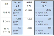 S-OIL 2019년 경영실적 (단위 : 억원) [산업경제뉴스 박진경 기자] S-OIL이 유가하락으로 지난해에 매출, 영업이익 등 경영실적이 모두 감소했다. S-OIL은 지난달 31일 2019년 연결기준 사업실적을 발표하면서 지난해에 판매량은 전년 수준을 유지했지만 매출은 제품 판매단가의 하락으로 전년 대비 4.2% 하락한 24조3,942억원을 기록했다고 밝혔다. 영업이익도 4,492억원을 기록했는데 전년보다 29.8%가 감소했으며 당기순이익은 865억원으로 66.5% 감소해서 절반 이하의 실적을 보였다. 각 사업부문별로는 정유사업부문의 영업이익이 253억원 적자를 실현했지만, 석유화학이 2,550억원, 윤활기유가 2,195억원의 이익을 실현해서 정유사업부문의 적자를 보완했다. ■ 2019년 4분기 실적 지난해 4분기 실적을 살펴보면, 매출액은 판매량 증가로 전분기 대비 3.9% 증가한 6조 4,762억원을 기록했다. 분기 영업이익은 정제마진 하락의 영향으로 전분기 대비 1,921억원 감소한 386억원을 기록하였으나 유가 안정화로 인해 전년동기 대비 흑자로 전환했다. 각 사업부문의 4분기 실적을 살펴보면, 정유 부문의 경우 중국 신규 정유설비의 상업 가동에