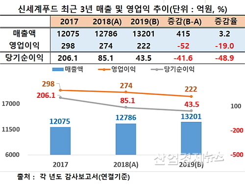 감사보고서에 의거해 신세계푸드의 2017년 이후 지난해까지 영업실적을 살펴보면 먼저 매출의 경우 연결재무제표 기준 2017년 1조2075억, 2018년 1조2786억, 2019년 1조3201억 원(전년비 3.2%↑)로 매년 사상 최대치를 갈아치우며 우상향하는 모양새를 연출하고 있다.