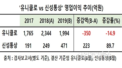 먼저 유니클로의 지난해 영업이익을 전년도와 비교해 보면 2018년도 2344억 원에서 지난해 1994억으로 14.9% 감소한 반면에, 신성통상은 249억 원에서 지난해 471억을 시현, 무려 89.7%나 급증해 대조를 보였다.