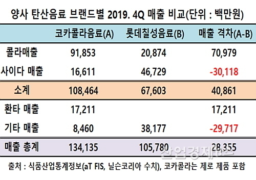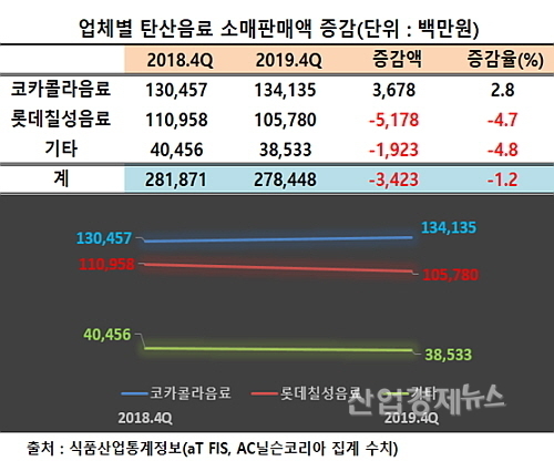 롯데칠성이 2018년 3분기 395.7억에서 지난해 4분기 381.7억으로 약 14억이 준 반면, 코카콜라사는 268억에서 256.7억으로 약 11.3억 원 감소에 그쳐, 롯데보다 감소폭이 적었다.