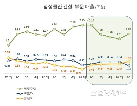 삼성물산 건설부문의 사업부문별 실적을 살펴보면, 먼저 주력사업인 빌딩(주택, 건축) 부문의 매출은 1조8340억원으로 작년 2분기 2조2430억원과 비교하면 18.3% 감소했다.