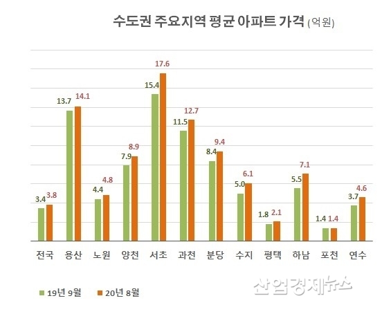 수도권 가운데 주요 지역 아파트 가격을 살펴보면, 서울에서는 비강남권인 용산구와 마포구가 각각 14억 600만원, 10억 400만원으로 10억원을 넘어섰으며, 경기에서는 과천이 12억 7000만원으로 10억원을 넘어섰다.