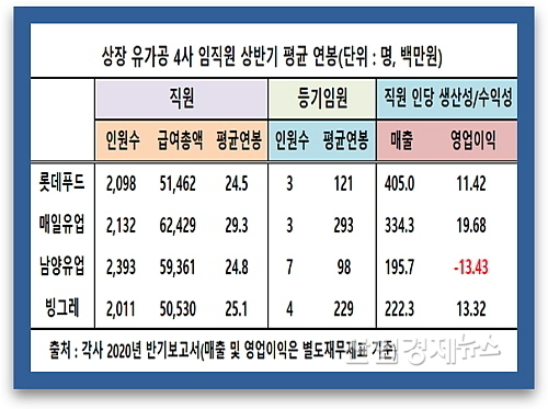 [산업경제뉴스 민경종 기자] 롯데푸드, 매일유업, 남양유업, 빙그레 등 국내 증시에 상장된 유가공업체 4사의 올 상반기 등기임원 및 직원 평균 연봉이 가장 높은 곳은 매일유업, 또 직원 1인당 생산성(매출액) 톱은 롯데푸드였던 것으로 나타났다.