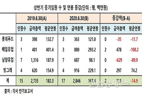 또 하나는 지난해 상반기 평균연봉이 4.01억인 매일유업이 올해는 2.93억으로 낮아진 점이다. 이는 지난해 상반기까지만 해도 김선희 대표가 유일한 등기임원이었지만, 올해는 조성형, 김환석 부사장 등이 새로 등기임원(상근)으로 선임돼 보수가 스프레드된 때문으로 추정된다.