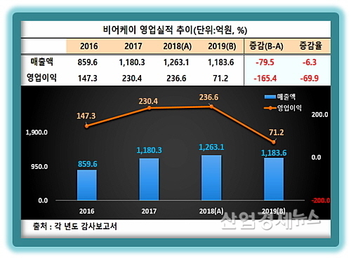 비어케이 감사보고서에 따르면 지난해 매출은 1183.6억 원으로 전년도 1263.1억 대비 약 6.3%가 줄었고, 영업이익은 71.2억 원에 그쳐 전년도 236.6억 대비 무려 165.4억이나 감소해 69.9% 급감하는 부진한 성적표를 시장에 내밀었다.