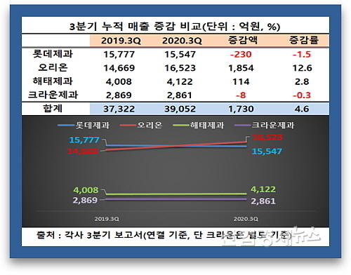 먼저 각사 3분기보고서에 의거해 해외법인 등 종속기업 실적이 반영된 연결재무제표 기준(단, 크라운제과는 종속법인이 없어 별도재무제표기준임) 4사의 합산 매출부터 살펴보면, 총 3조9052억 원을 시현, 전년 동기 3조7322억보다 1730억이 늘어 4.6% 가량 증가했다.