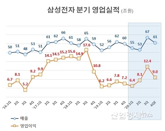 삼성전자가 최근 공시한 삼성전자 2020년 4분기 잠정실적에 따르면, 삼성전자는 매출 61조원, 영업이익 9조원으로, 전년 동기 대비 매출은 1.87% 증가로 미미한 증가세를 보였지만 영업이익은 25.7%나 증가했다.