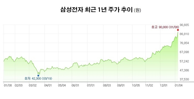 지난해 11월까지만해도 5~6만원대에 머물던 삼성전자의 주가는 12월 한 달 동안 7만원과 8만원 선을 뚫더니 지난 주말 9만원에 마감됐다.
