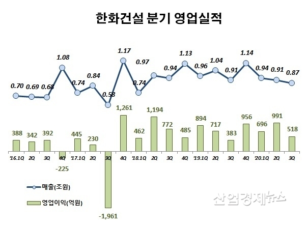 한화건설은 지난해 3분기에 매출은 8725억원, 영업이익은 518억원을 실현했다. 다른 분기에 비해 다소 낮은 실적이지만, 1~3분기 누적 매출은 2조 7258억원, 영업이익 2205억원, 당기순이익 1709억원을 실현하면서 예년 수준을 유지하고 있다.