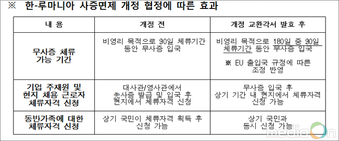 기존의‘한-루마니아 사증면제 협정’이 개정되어 우리 기업의 주재원과 한국인 근로자가 사증 없이 루마니아에 입국해서 현지에서 바로 체류허가를 신청할 수 있게 되었다.